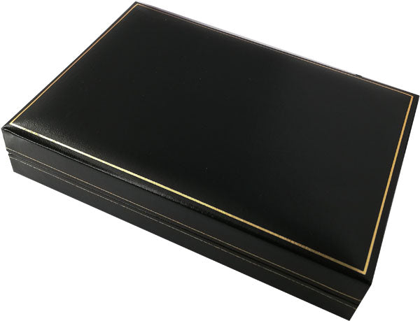 Een verfijnd lederlook sieradendoosje voorzien van een gouden bies. De luxe zachte velours binnenbekleding beschermt het juweel. Deze tijdloze klassieker behoudt zijn aantrekkingskracht dankzij zijn elegante uitstraling en voegt een vleugje distinctie toe aan het sieraad, waardoor het een waardevolle uitstraling krijgt.